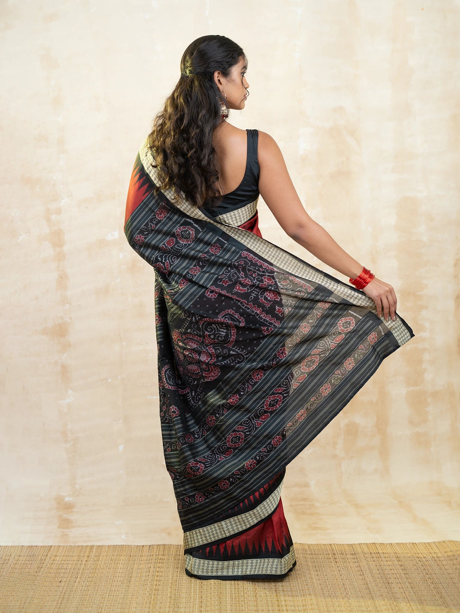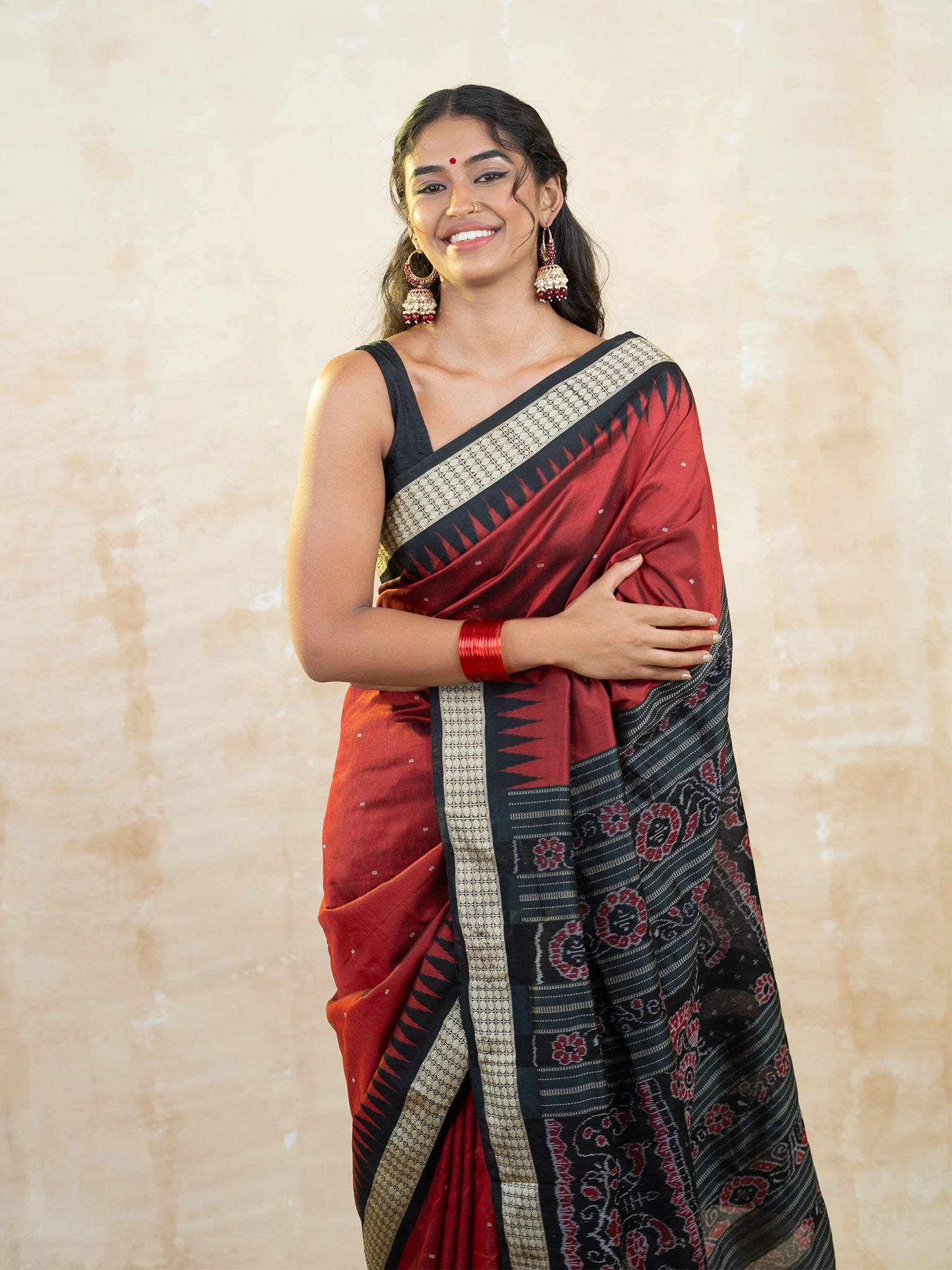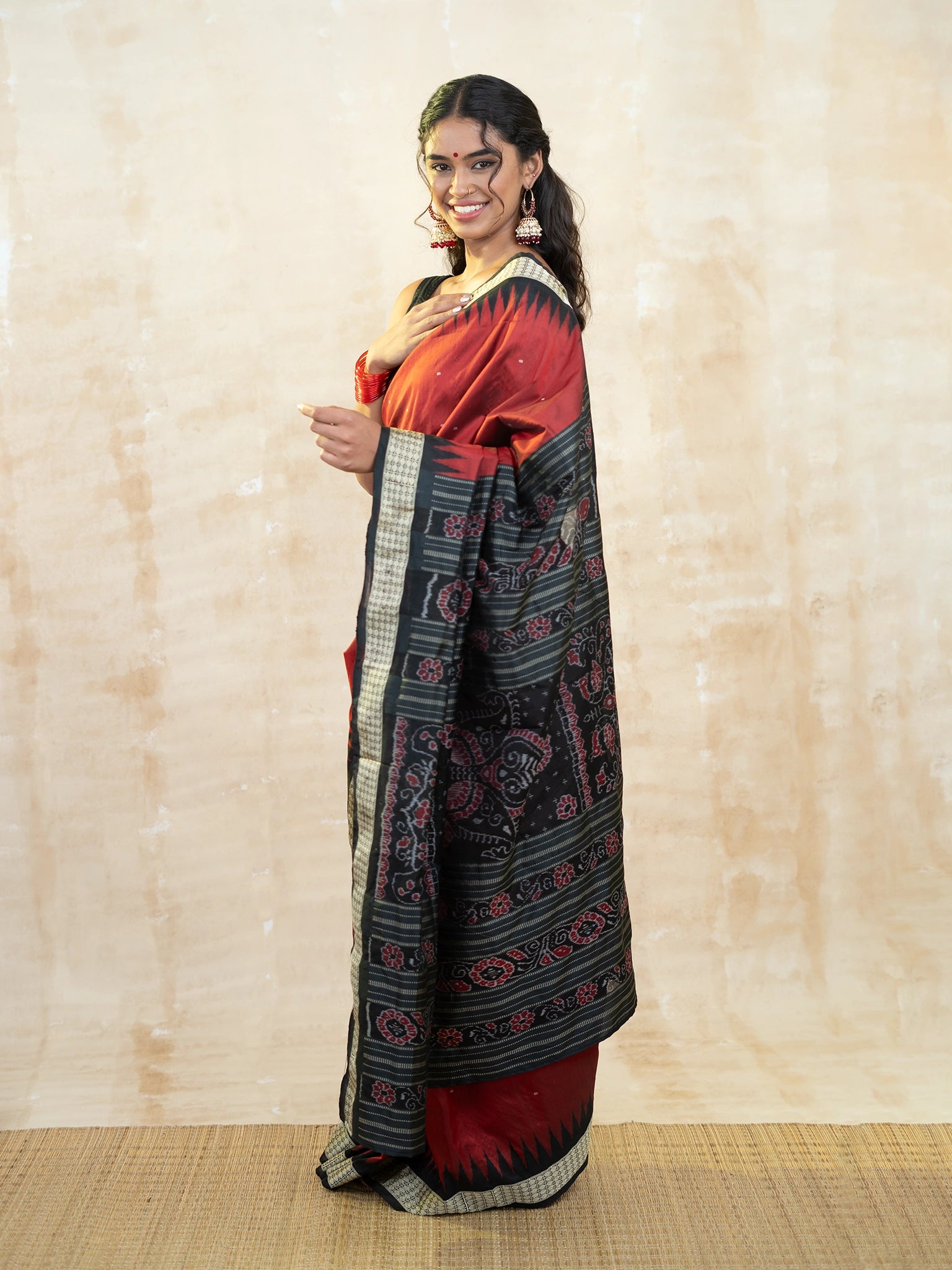 Odisha Sambalpuri Dark Coral Red & Black Ikkat Silk Saree Without Blouse