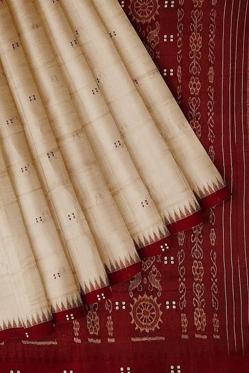 A distinctive feature of the Sambalpuri saree is the design of the border and pallu (the loose end of the saree). While the body of the saree features an intricate pattern, the border typically features bold, solid designs. The pallu, on the other hand, is often more elaborate and detailed, showcasing the most complex patterns. The pallu may feature symbols such as peacock motifsfloral vines, or geometrical designs.