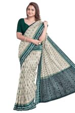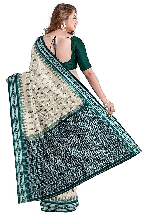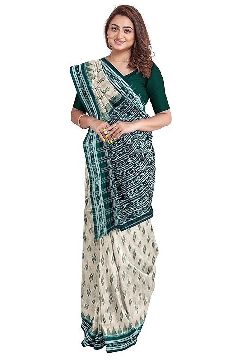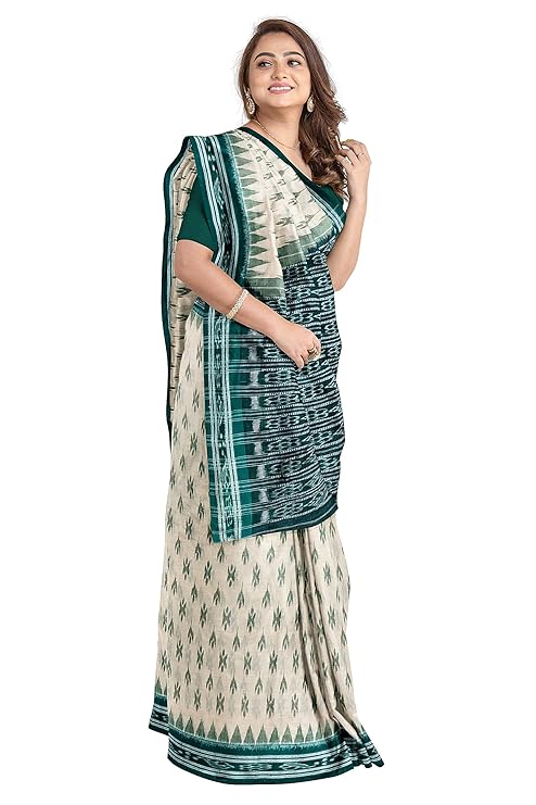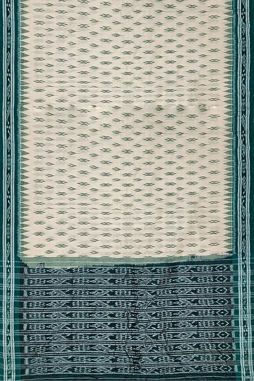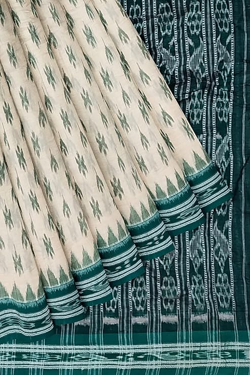 Odisha Sambalpuri Handloom Ikat Women Beige & Green Cotton Saree, Odisha Handloom Without Blouse