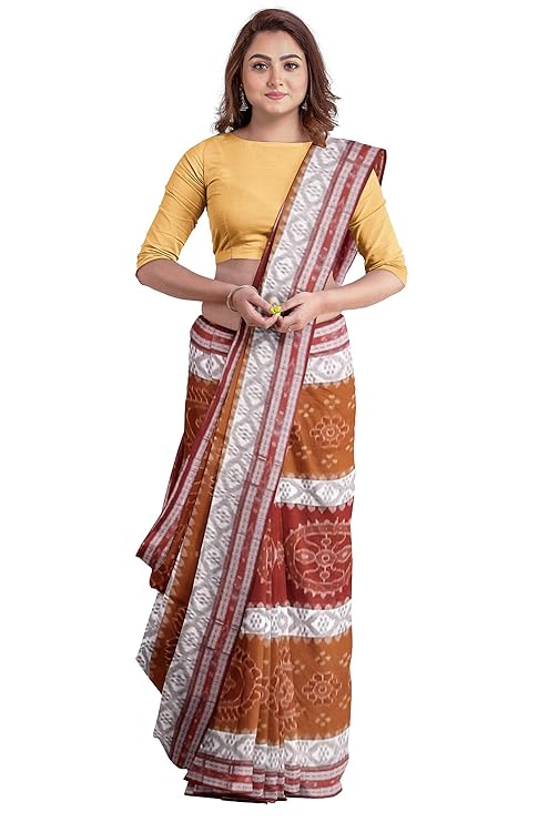 Odisha Sambalpuri Handloom Ikat Women Brown Cotton Saree, Odisha Handloom Without Blouse