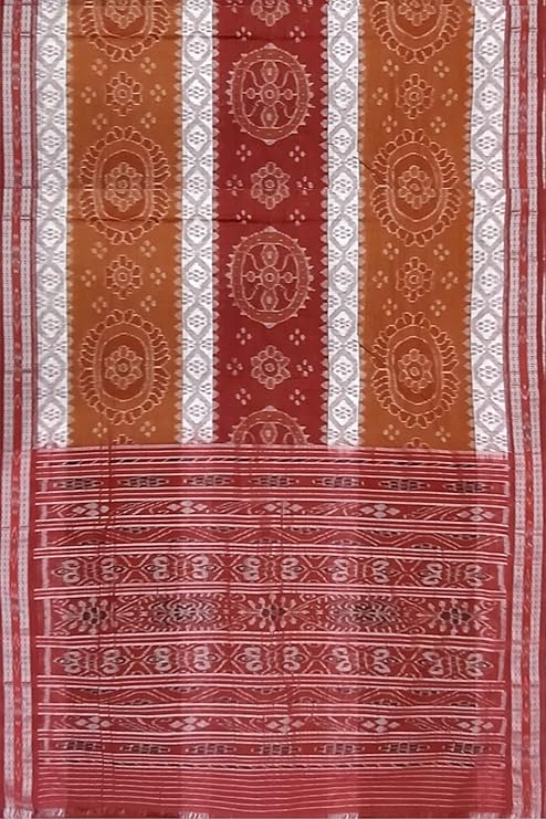 A distinctive feature of the Sambalpuri saree is the design of the border and pallu (the loose end of the saree). While the body of the saree features an intricate pattern, the border typically features bold, solid designs. The pallu, on the other hand, is often more elaborate and detailed, showcasing the most complex patterns. The pallu may feature symbols such as peacock motifsfloral vines, or geometrical designs.