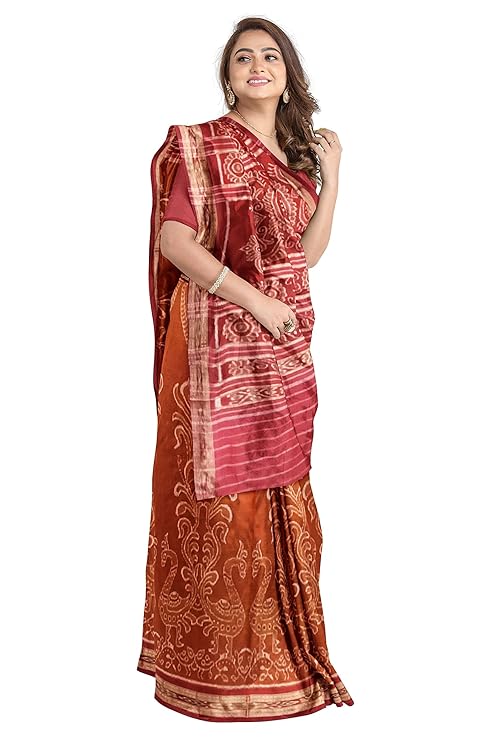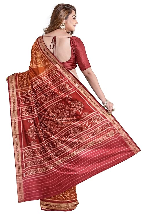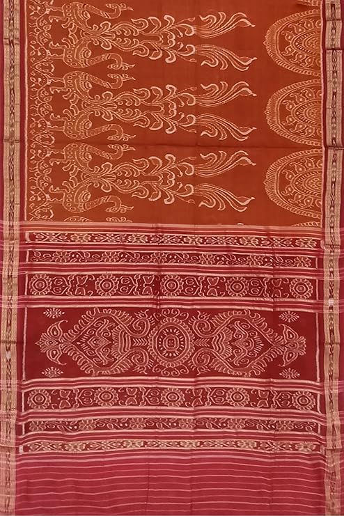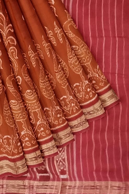A distinctive feature of the Sambalpuri saree is the design of the border and pallu (the loose end of the saree). While the body of the saree features an intricate pattern, the border typically features bold, solid designs. The pallu, on the other hand, is often more elaborate and detailed, showcasing the most complex patterns. The pallu may feature symbols such as peacock motifs, floral vines, or geometrical designs.