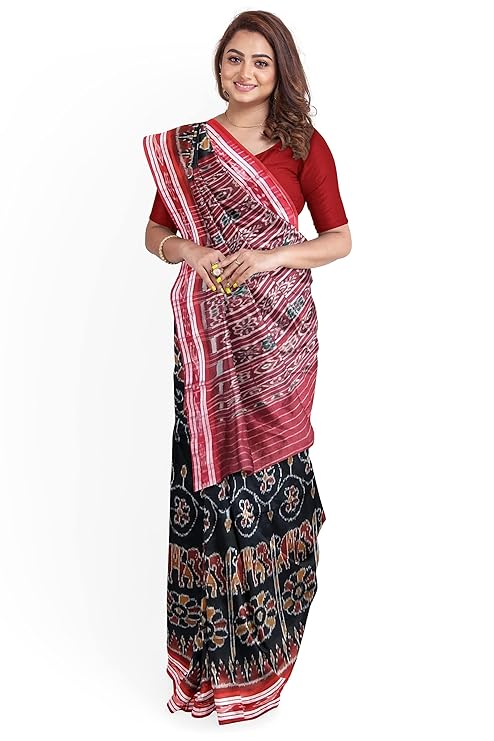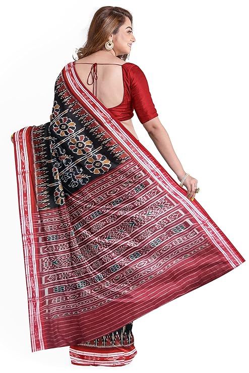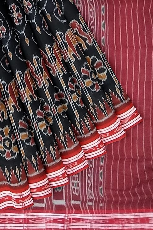 A distinctive feature of the Sambalpuri saree is the design of the border and pallu (the loose end of the saree). While the body of the saree features an intricate pattern, the border typically features bold, solid designs. The pallu, on the other hand, is often more elaborate and detailed, showcasing the most complex patterns. The pallu may feature symbols such as peacock motifs, floral vines, or geometrical designs.