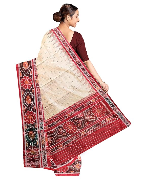 A distinctive feature of the Sambalpuri saree is the design of the border and pallu (the loose end of the saree). While the body of the saree features an intricate pattern, the border typically features bold, solid designs. The pallu, on the other hand, is often more elaborate and detailed, showcasing the most complex patterns. The pallu may feature symbols such as peacock motifsfloral vines, or geometrical designs.